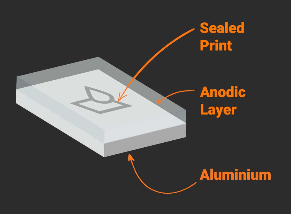 The information is sealed into the anodic layer of the aluminum, making it impossible to erase or scratch.